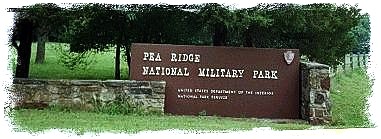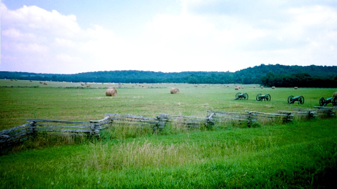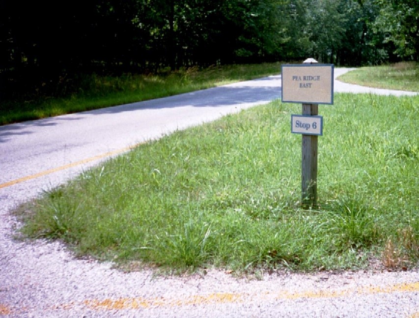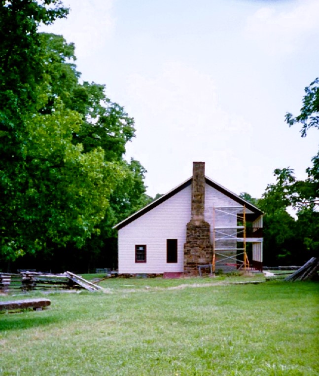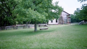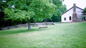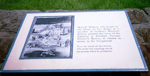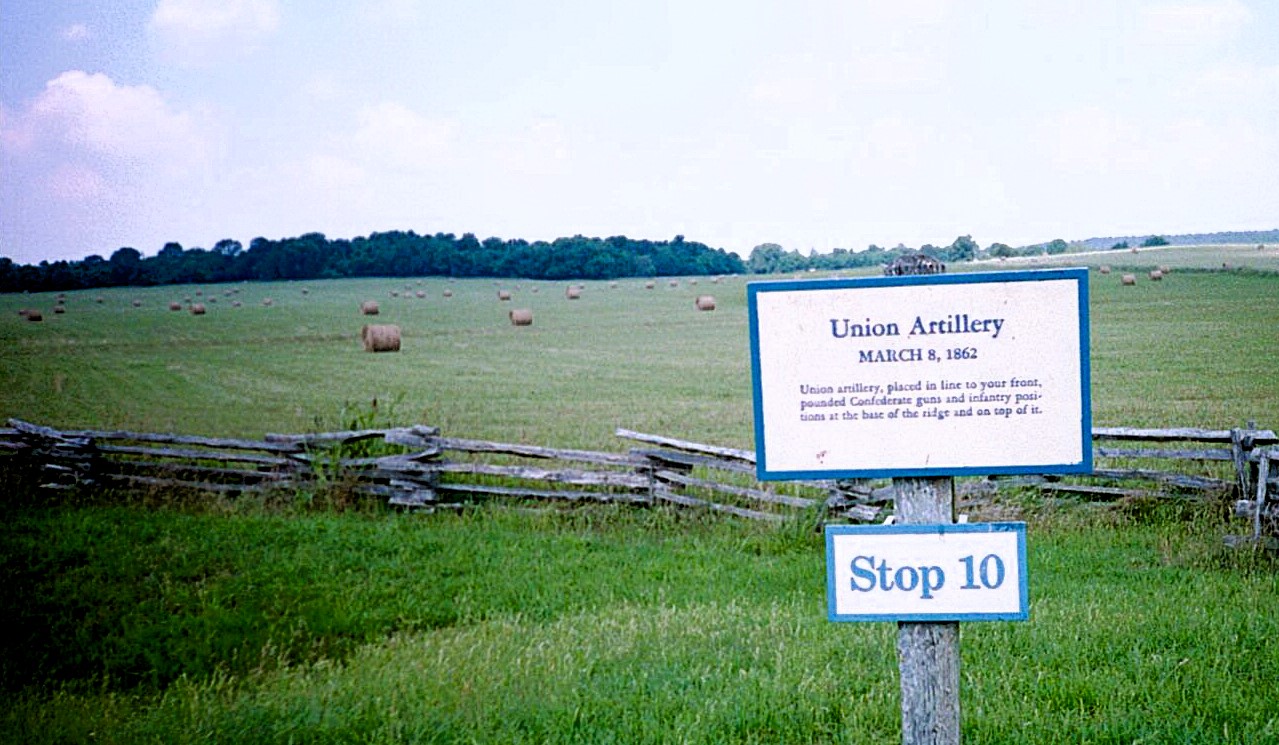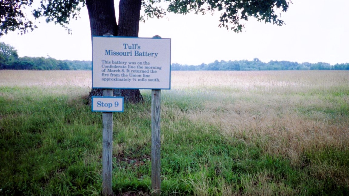 "Hunt P. Wilson, who fought in the Batle of Pea Ridge as a member of Guibor's Missouri Battery, painted this scene of the fighting at Elkhorn Tavern. Guibor's Battery is shown in action in the foreground. You are south of the tavern. The artist was standing east of the tavern when he painted it."