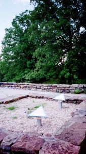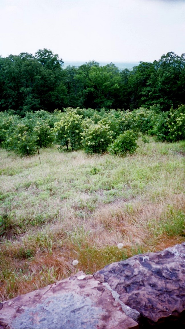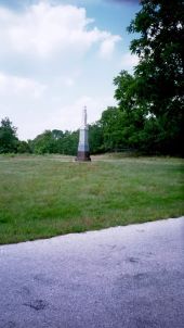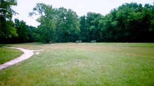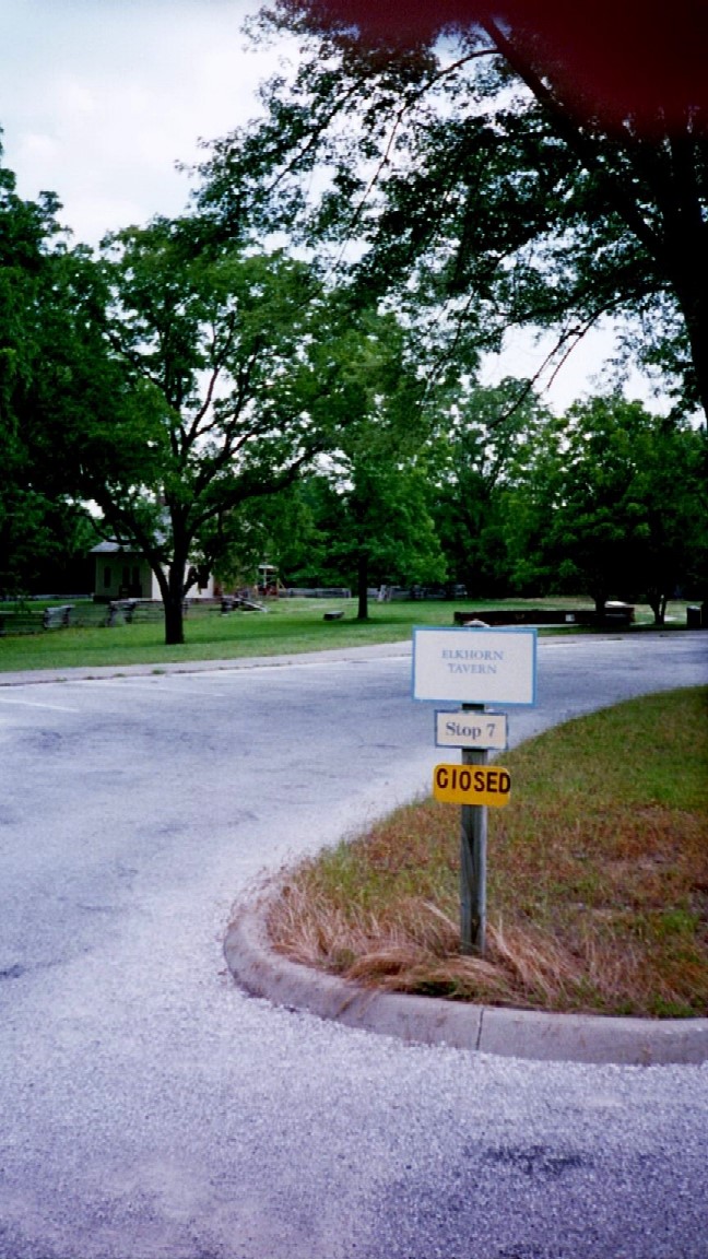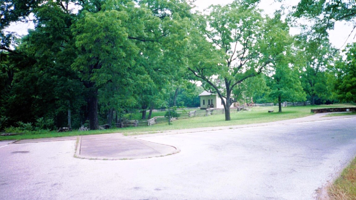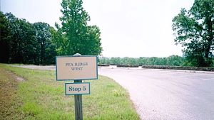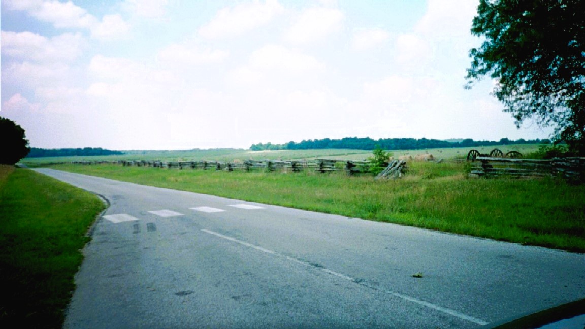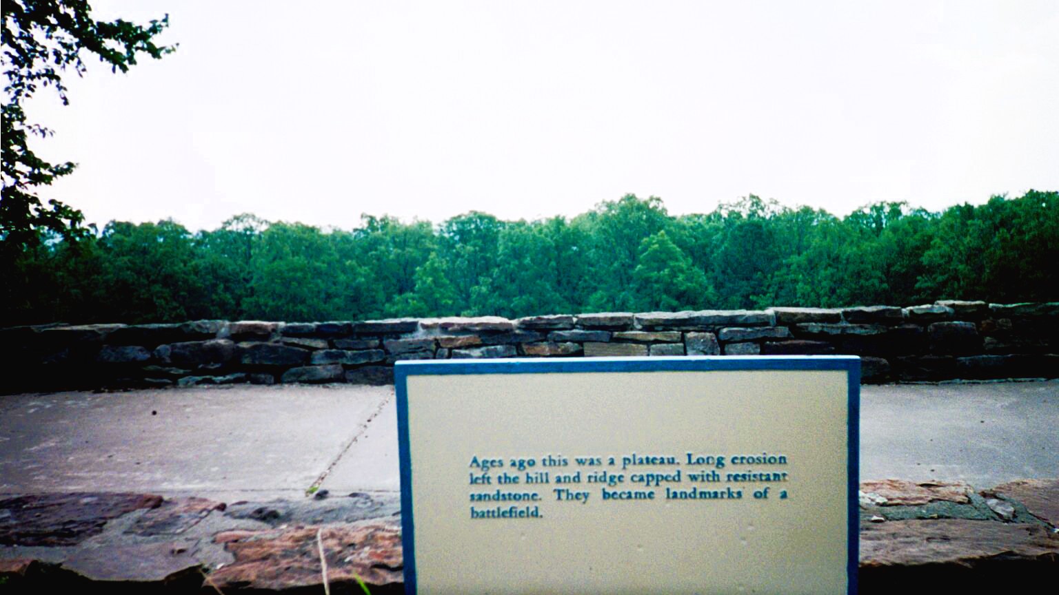 "Hunt P. Wilson, who fought in the Batle of Pea Ridge as a member of Guibor's Missouri Battery, painted this scene of the fighting at Elkhorn Tavern. Guibor's Battery is shown in action in the foreground. You are south of the tavern. The artist was standing east of the tavern when he painted it."