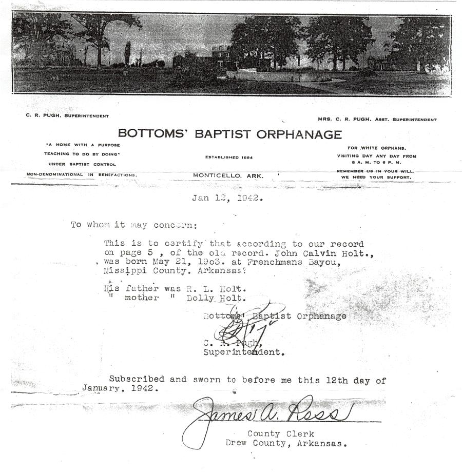 From the "Bottom's Baptist Orphanage," certifying the birth of John Calvin Holt. It was signed by the superintendent of the home and the County Clerk of Drew County.
