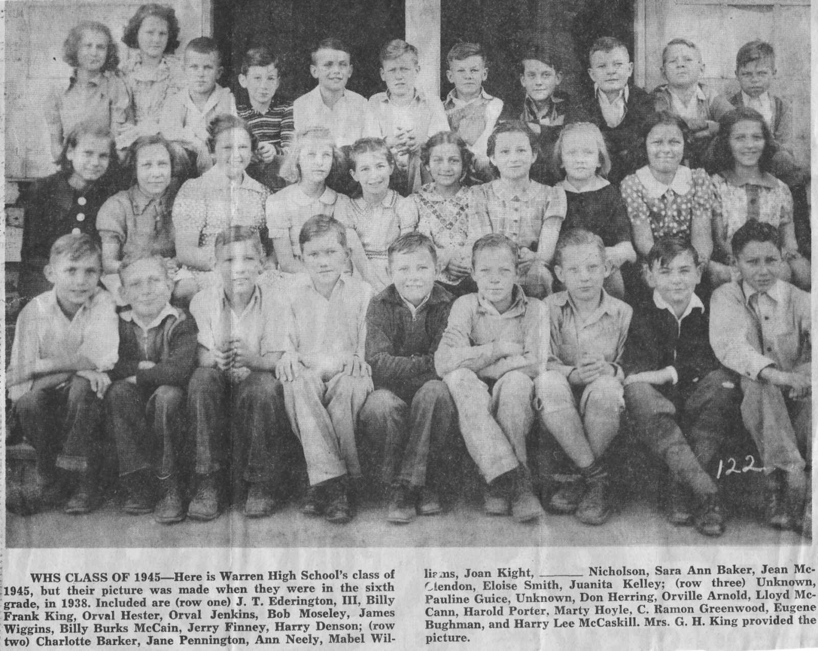 Warren High School Class of 1945 in 1938 Warren High School Class of 1945 in 1938 "WHS CLASS OF 1945" "Here is Warren High School's class of 1945, but their picture was made when they were in the sixth grade, in 1938. Included are (row one) J. T. Ederington, III, Billy Frank King, Orval Hester, Orval Jenkins, Bob Moseley, James Wiggins, Billy Burks McCain, Jerry Finney, Harry Denson; (row two) Charlotte Barker, Jane Pennington, Ann Neely, Mabel Williams, Joan Kight, ______ Nicholson, Sara Ann Baker, Jean McClendon, Eloise Smith, Juanita Kelley; (row three) Unknown, Pauline Guice, Unknown, Don Herring, Orville Arnold, Lloyd McCann, Harold Porter, Marty Hoyle, C. Ramon Greenwood, Eugene Bughman, and Harry Lee McCaskill. Mrs. G. H. King provided the picture." Click on the picture above to see a larger image of the photo.