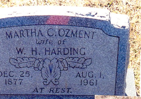 | Harding, Martha C. Ozment | Dec 25, 1877 | Aug 1 1961 | "wife of W. H. HARDING; AT REST" | CS |