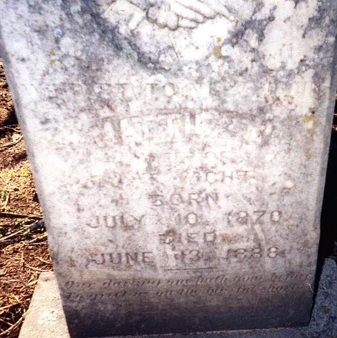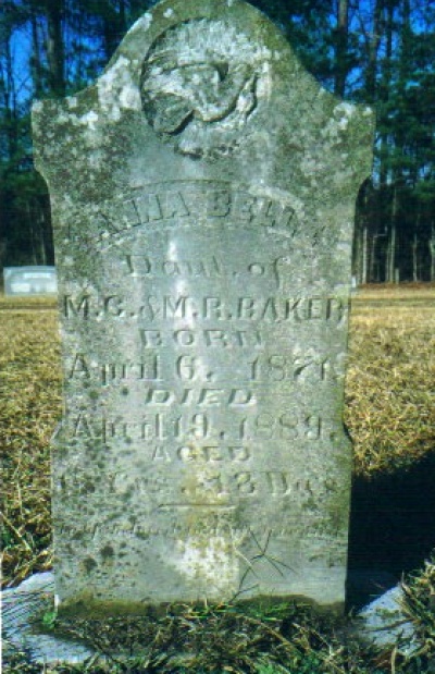 | Baker, Anna Belle | 6 Apr. 1871 | 19 apr. 1889 | "Aged 11 years 13 days" [d/o M. G & M. R Baker] | CM |