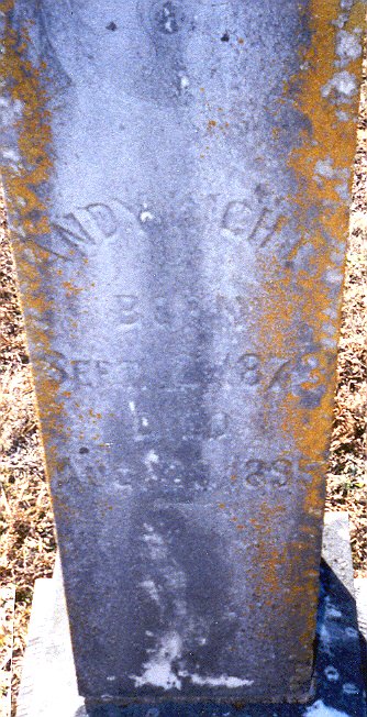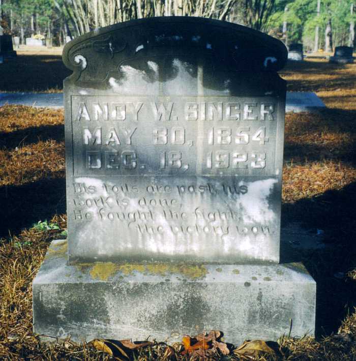 | Singer, Andy [Andrew] W. | 30 May 1854 | 18 Dec 1923 | "His toils are past, his work is done, He founght the fight, the victory won." [h/o Mittie L. Adams; s/o Thomas Singer & Mary Ann Groce] | CM |