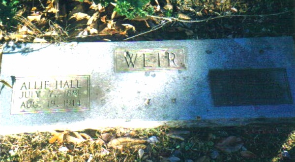 | Weir, Allie Hall | 7 Jul 1881 | 19 Aug. 1914 | Double Stone with James S. Weir | CM |