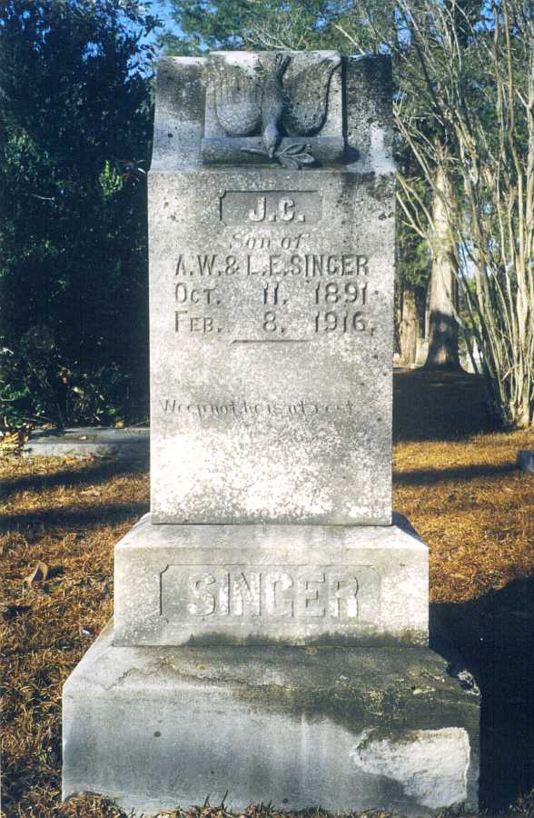| Singer, J. C. | 11 Oct 1891 | 8 Feb 1916 | "Son of A. [Andy] W. Singer & L. E. [Mittie L.Adams] Singer" "Weep not, he is at rest" | CM |