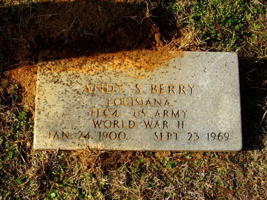 | Berry, Andy S. | 24 Jan 1900 | 23 Sep 1969 | "LOUISIANA" "TEC4 US ARMY" "WORLD WAR II" Military Stone with Cross Symbol | LH |