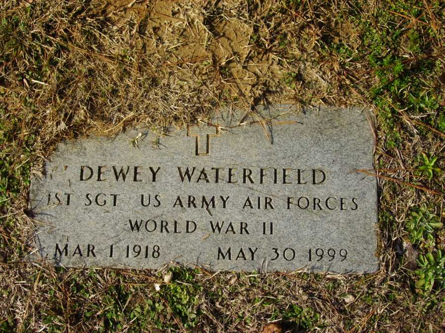 | Waterfield, Dewey | 1 Mar 1918 | 30 May 1999 | "T SGT US ARMY AIR FORCE" "WORLD WAR II" Military Stone with Cross Symbol | LH |