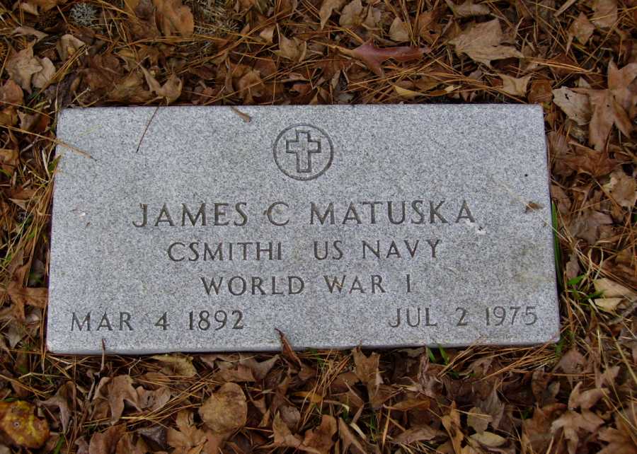 | Matuska, James C. | 4 Mar 1892 | 2 Jul 1975 | "CSMITH1 US NAVY" "WORLD WAR I" Military Stone with Cross Symbol | LH |