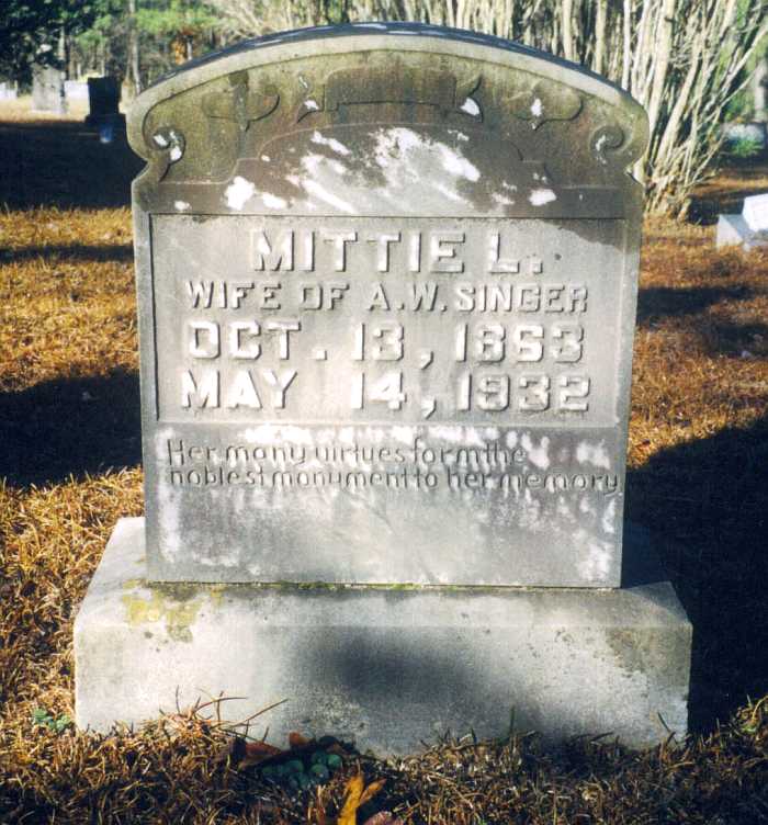 | Singer, Mittie L. | 13 Oct 1863 | 14 May 1932 | "Her many virtues form the noblest monument to her memory" [w/o Andy W. Singer; Children: Lummie, William T. & J. Clifton Singer] | CM |