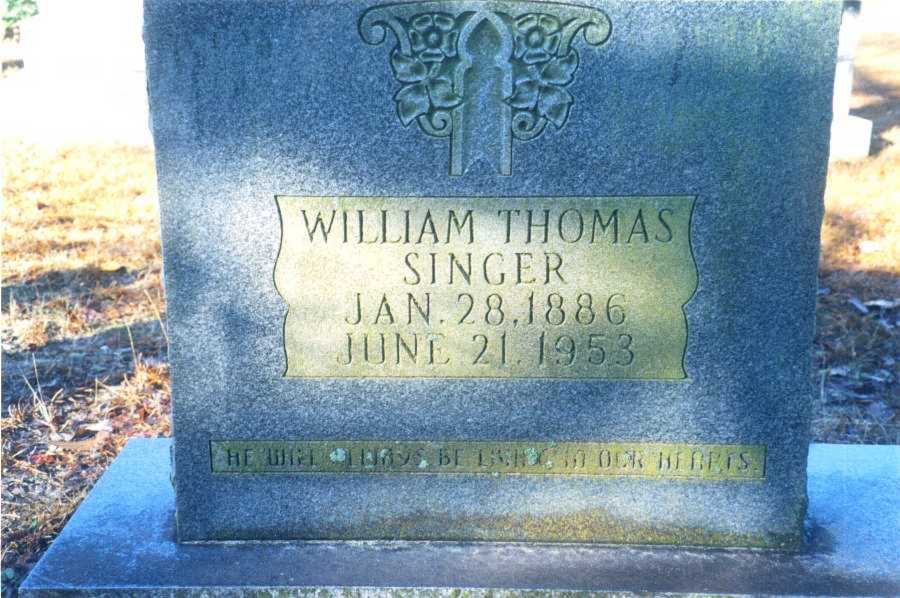 | Singer, William Thomas | 28 Jan 1886 | 21 Jun 1953 | "HE WILL ALWAYS BE LIVING IN OUR HEART" [h/o Allie E Stough; s/o Andrew W. Singer & Mittie L. Adams; Children: Ester & Willie Mae Singer] | CM |