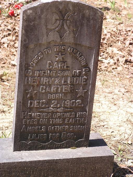 | Carl Carter - NEW PHOTO! 3-17-2009 | Dec 2, 1902 | Dec 2, 1902 | "SACRED TO THE MEMORY OF CARL INFANT SON OF HENRY & LUDIE CARTER" "HE NEVER OPENED HIS EYES ON THIS EARTH, ANGELS GATHER SUCH LILIES FOR GOD." *BB |