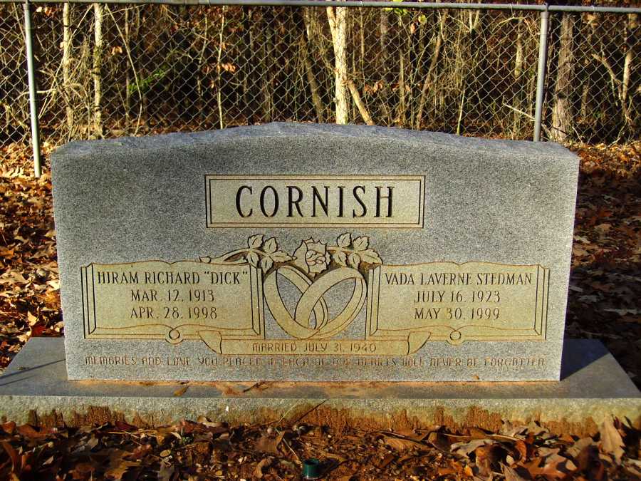 | Hiram Richard "Dick" Cornish | Mar 12, 1913 | Apr 28, 1998 | "MARRIED July 31, 1940" "MEMORIES AND LOVE YOU PLACED IN EACH OF OUR HEARTS WILL NEVER BE FORGOTTEN" Double Stone with Vada Laverne Stedman Cornish *LH |