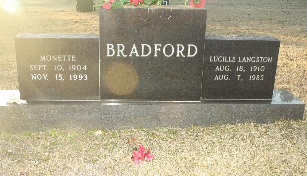 | Bradford, Monette | September 10, 1904 | November 15, 1993 | DOUBLE STONE with Lucille Langston Bradford | JW & SD | 84325012 |