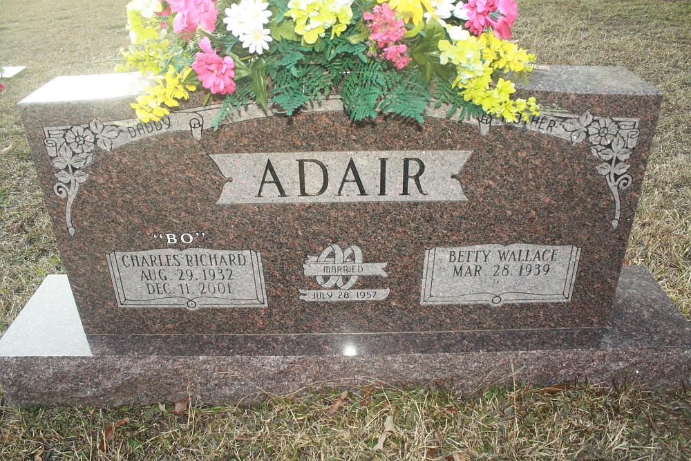 | Adair, Betty Wallace | March 28, 1939 | Double Stone with "Bo" Charles Richard Adair "MARRIED JULY 28, 1957" "MOTHER" "DADDY" | SD | 84376153 | |