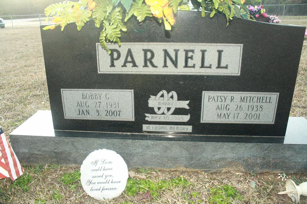 | Parnell, Bobby G. [Gene, Sr.] | August 27, 1931 | January 3, 2007 | Double Stone with Patsy R. Mitchell Parnell; "MARRIED MAY 30, 1969" "IN LOVING MEMORY" EXTRA STONE "If love could have saved you, You would have lived forever." | JW & SD | 84376501 |