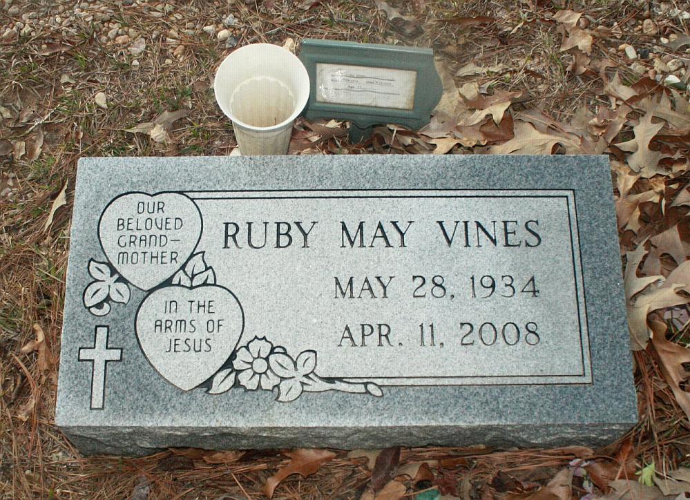 | Vines, Ruby May | May 28, 1934 | April 11, 2008 | "OUR BELOVED GRANDMOTHER" "IN THE ARMS OF JESUS" Cross, hearts and floral designs [d/o William & Hattie Gorman Vines; w/o 1) James Donald Vines & 2) Paul Vines] | NJ & SD | 84329679 |