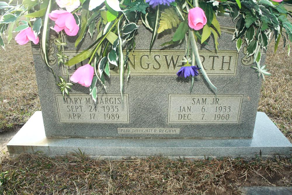 | Hollingsworth, Mary M. [L. Morgan] Hargis | September 24, 1935 | April 17, 1989 | Double Stone with Sam Hollingsworth, Jr.; "OUR DAUGHTER REGINA" [d/o Hollis & Mildred Morgan] | JW & SD | 84376687 |
