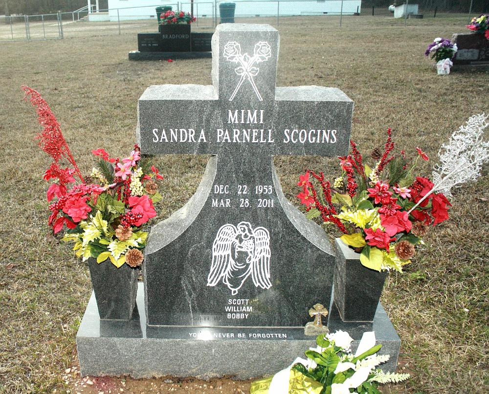 | Scogins, Sandra [Jean] Parnell "Mimi" | December 22, 1953 | March 28, 2011 | Cross-shaped Stone; Roses and Angel designs; "SCOTT" "WILLIAM" "BOBBY" "YOU'LL NEVER BE FORGOTTEN" [w/o Kenneth Harton] | SD | 84376070 |