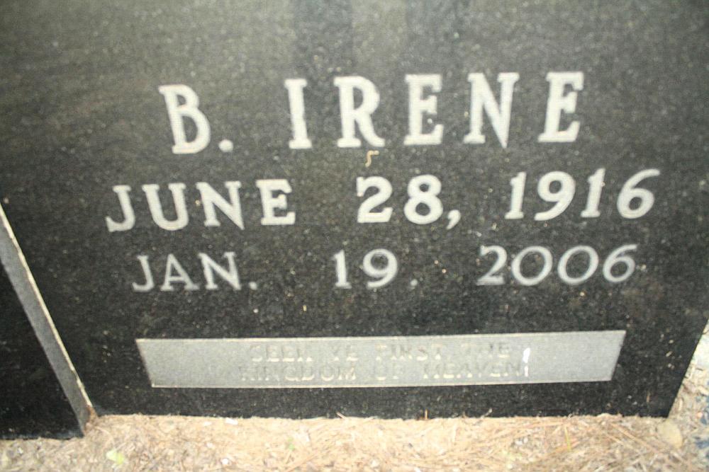 | Simmons, B. [Beulah] Irene [Doggett] | June 28, 1916 | January 19, 2006 | DOUBLE STONE with J. Herbert Simmons; "SEEK YE FIRST THE KINGDOM OF HEAVEN" [d/o Wood & Mary Parnell Doggett] | JW & SD | 84376335 |