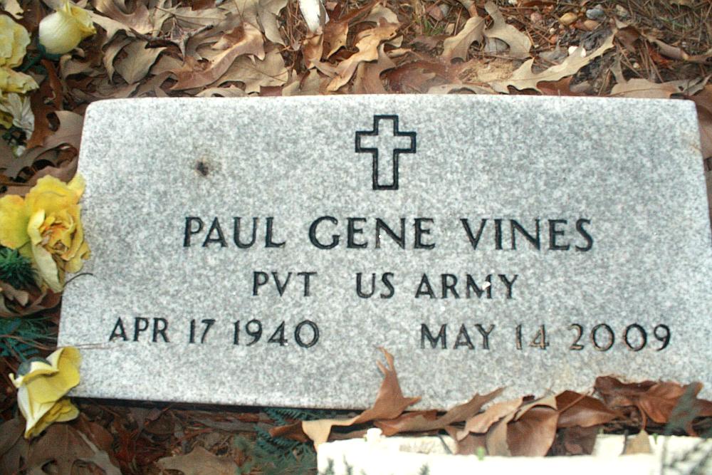 | Vines, Paul Gene | April 17, 1940 | May 14, 2009 | Military Stone; Cross, "PVT US ARMY" [h/o Ruby May Gorman Vines] | SD | 84329529 |