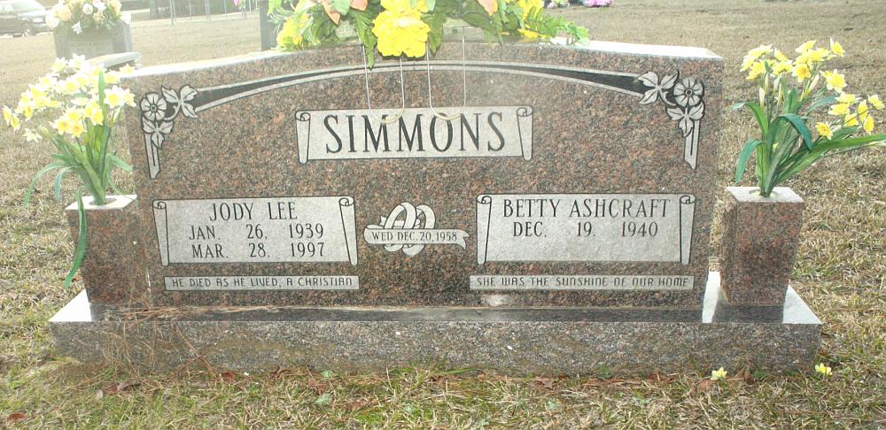 | Simmons, Jody Lee | January 26, 1939 | March 28, 1997 | Double Stone with Betty Ashcraft Simmons; "WED DEC. 20, 1958" "HE DIED AS HE LIVED, A CHRISTIAN" "SHE WAS THE SUNSHINE OF OUR HOME" BACK OF STONE "SIMMONS" "OUR CHILDREN" "GAIL" "DAVID" "MARK" | SD | 84376394 |