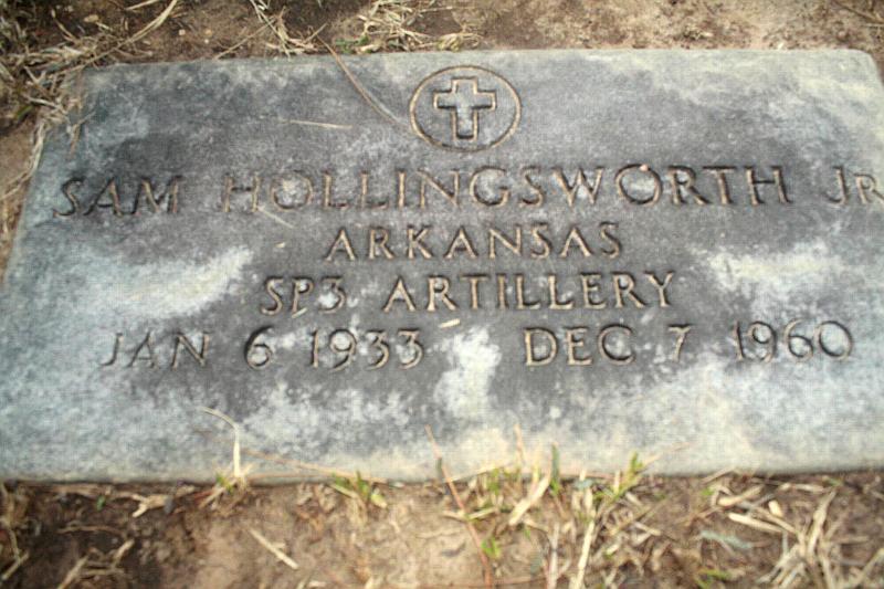 | Hollingsworth, Sam, Jr. | January 6, 1933 | December 7, 1960 | Double Stone with Mary M. Hargis Hollingsworth; "OUR DAUGHTER REGINA" EXTRA MILITARY STONE "ARKANSAS" "SP3 ARTILLERY" Cross in circle emblem | JW & SD | 84376632 |