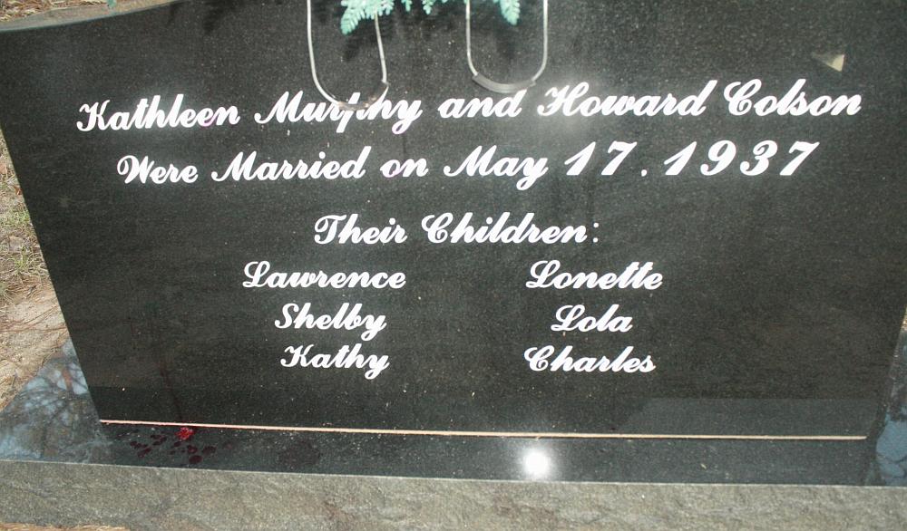 | McDonald, Kathleen Murphy Colson | August 22, 1921 | October 31, 2004 | "Our Precious Mother" Photograph; BACK OF STONE "Kathleen Murphy and Howard Colson" "Were Married on May 17, 1937" "Their Children :" "Lawrence" "Lonette" "Shelby" "Lola" "Kathy" "Charles" | JW & SD | 84376788 |