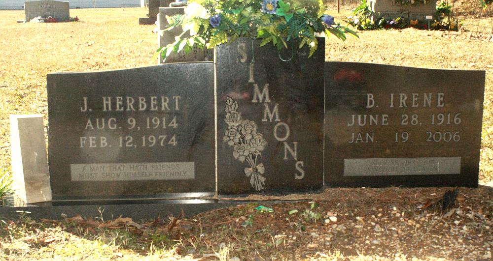 | Simmons, J. [Joseph] Herbert | August 9, 1914 | February 12, 1974 | DOUBLE STONE with Irene [Doggett] Simmons; "A MAN THAT HATH FRIENDS MUST SHOW HIMSELF FRIENDLY" | JW & SD | 84376274 |
