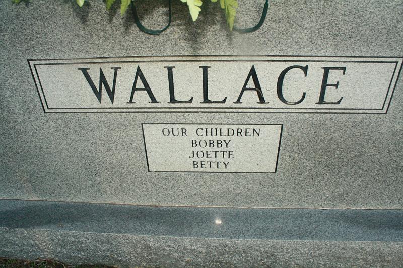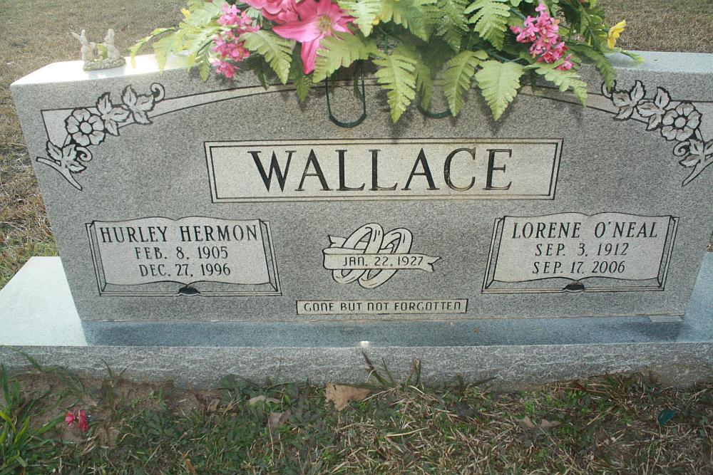| Wallace, Lorene O'Neal | September 3, 1912 | September 17, 2006 | Double Stone with Hurley Hermon Wallace "JAN. 22, 1927" Wedding ring design; "GONE BUT NOT FORGOTTEN" BACK OF STONE "WALLACE" "OUR CHILDREN" "BOBBY" "JOETTE" "BETTY" | SD | 84329471 |