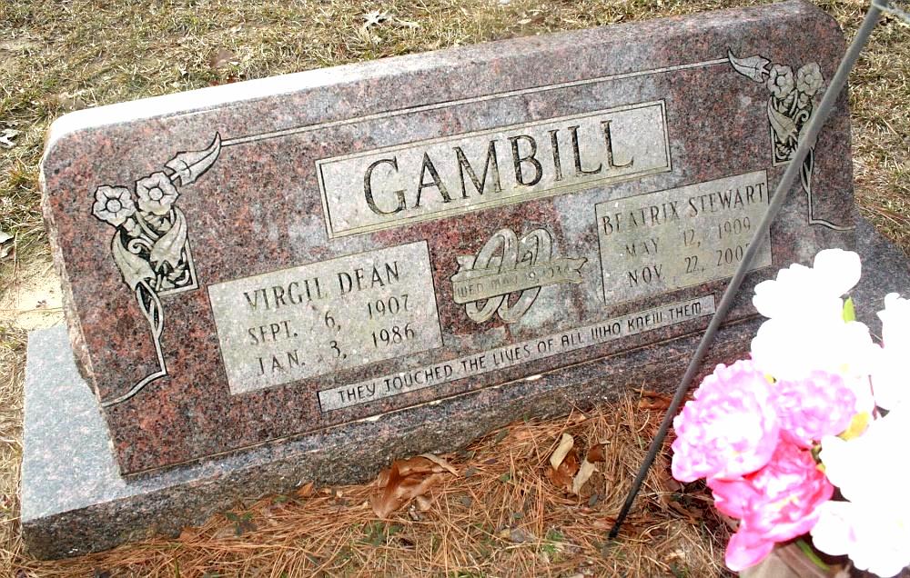 | Gambill, Virgil Dean | September 6, 1907 | January 3, 1986 | Double Stone with Beatrix Stewart Gambill "WED MAY 19, 1934" "THEY TOUCHED THE LIVES OF ALL WHO KNEW THEM" | JW & SD | 84376867 |