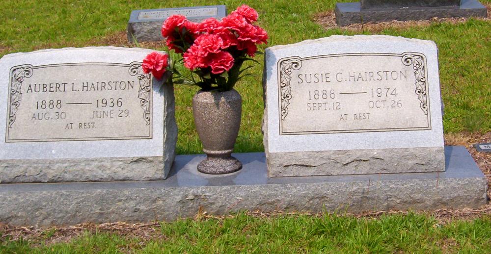 | Hairston, Aubert L. | Aug. 30, 1888 | June 29, 1936 | Double Stone with Susie G. Hairston; "AT REST" | AR & PC |