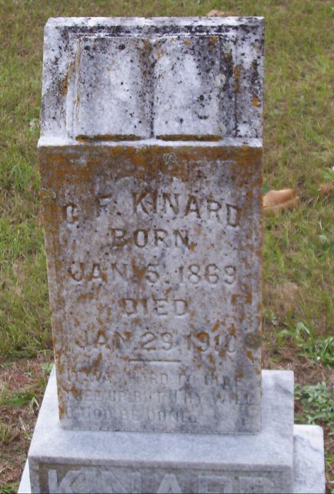 | Kinard, C. F. (or G. F.) | Jan 15, 1869 | Jan 29, 1918 | "IT WAS HARD TO GIVE THEE UP, BUT THY WILL O GOD BE DONE." | PC |