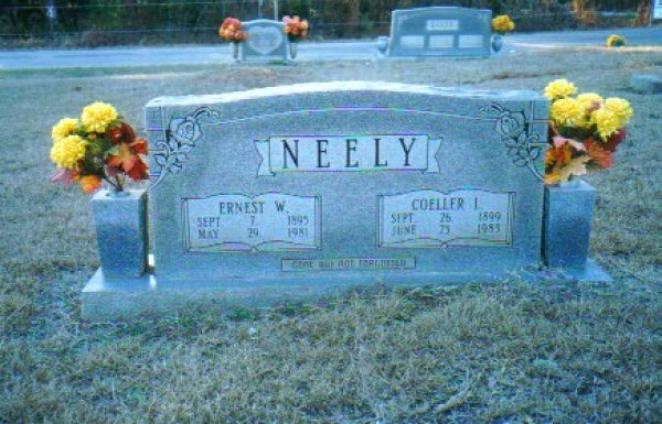 | Neely, Ernest W. | Sept 7, 1895 | May 29, 1981 | "GONE BUT NOT FORGOTTEN" Double Stone with Coeller L. Neely [s/o Marshall Hamilton Neely & Ida Ann Kinard; h/o Coeller Lanier Neely; children Maxine Neely Adair & Iva Nell Neely Williams] | CM |