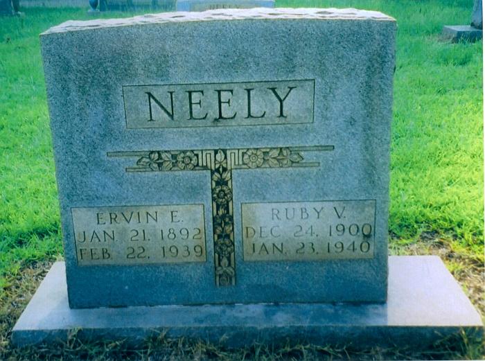 | Neely, Ervin E. [Edward] | 21 Jan 1892 | 22 Feb. 1939 | Double Stone with Ruby V. Wear Neely [s/o Marshall H. Neely & Ida Naccissa Ann Kinard Neely] | CM |