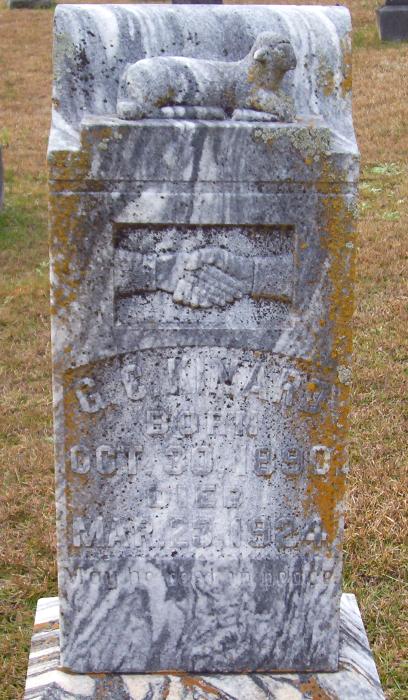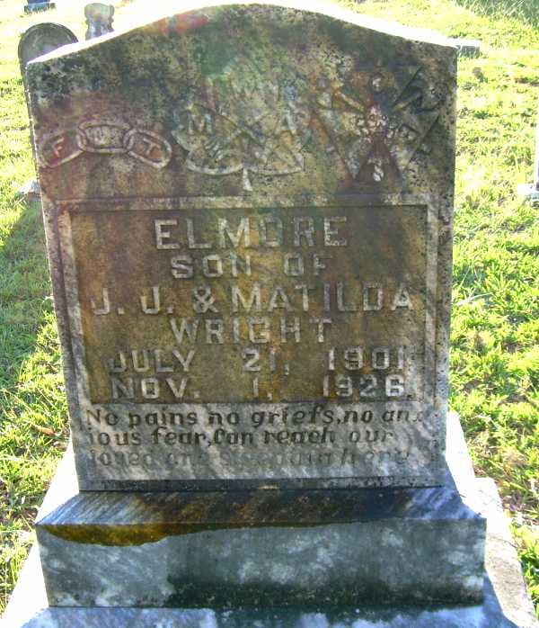 | Wright, Elmore | 7-21-1901 | 11-1-1926 | "SON OF J. J. & MATILDA WRIGHT" "No pains, no griefs, no anxious fear, Can reach our loved one sleeping here." Headstone Symbols; Independent Order of Odd Fellows "FLT" for Friendship, Love and Truth; Modern Woodmen of America "MWA" the original name of the Woodmen of the World; and the Antique Knights Of Pythias "FOB" for Friendship, Charity and Benevolence [s/o John Jeff Wright & Mathilda Wright] | SW |