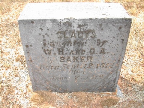 | Baker, Gladys | Sept 12, 1912 | June 7, 1913 | "Daughter of W. H. and O. A. BAKER" [d/o William Henry and Odie Seymore Baker] | AR |