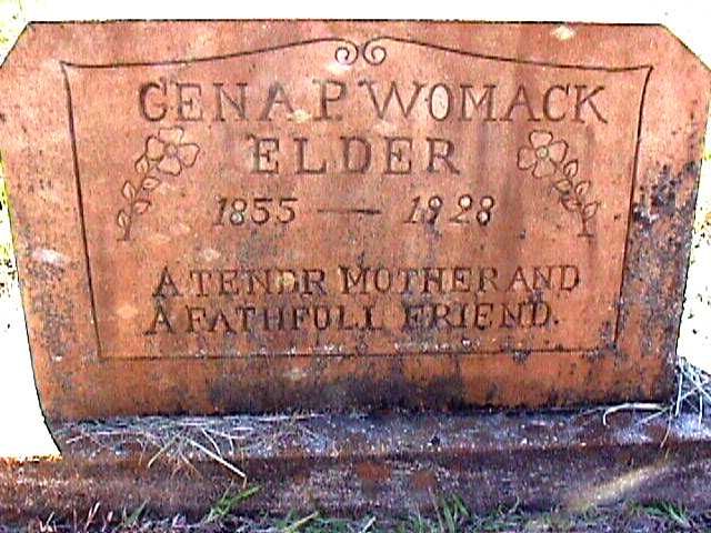 | Elder, Gena P. Womack | 1855 | 1928 | "A TENDER MOTHER AND A FAITHFUL FRIEND" [w/o William Elder] | NJ |