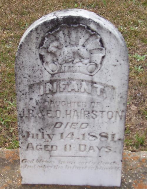 | Hairston, Infant | July 14, 1881 | “INFANT DAUGHTER OF J. B. & E. O. Hairston” “AGED 11 DAYS” "AT REST" | PC | |