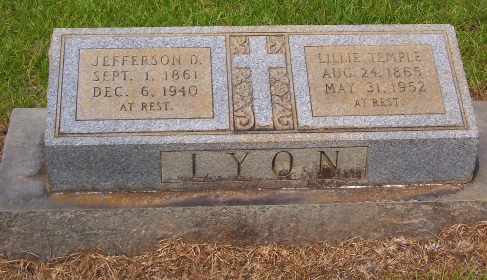 | Lyon, Lillie Temple | Aug 24, 1865 | May 31, 1952 | "AT REST" Double Stone with Jefferson D. Lyon | PC |