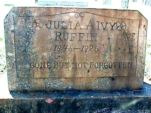 | Ruffin, Julia A. Ivy | 1846 | 1926 | "GONE BUT NOT FORGOTTEN" [Middle Name Ann; w/o John Ruffin; Married 11-17-1867] | NJ |