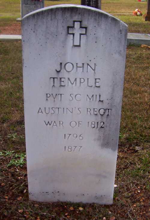 | Temple, John | 1796 | 1877 | "PVT SC MIL AUSTIN’S REGT WAR OF 1812" Cross Symbol | PC |