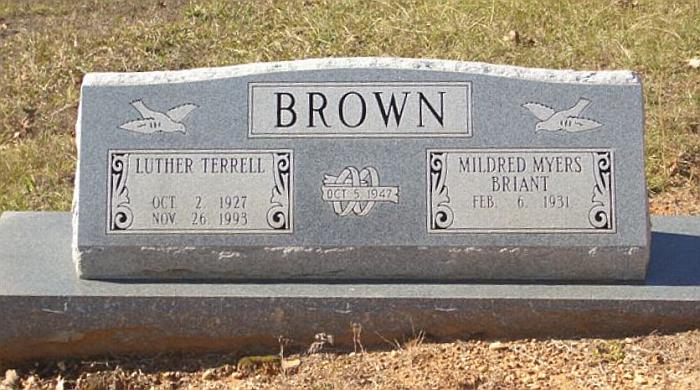 | Brown, Mildred Myers Briant | Feb. 6, 1931 | Double Stone with Luther Terrell Brown [Married] "Oct. 5, 1947" | BB | |