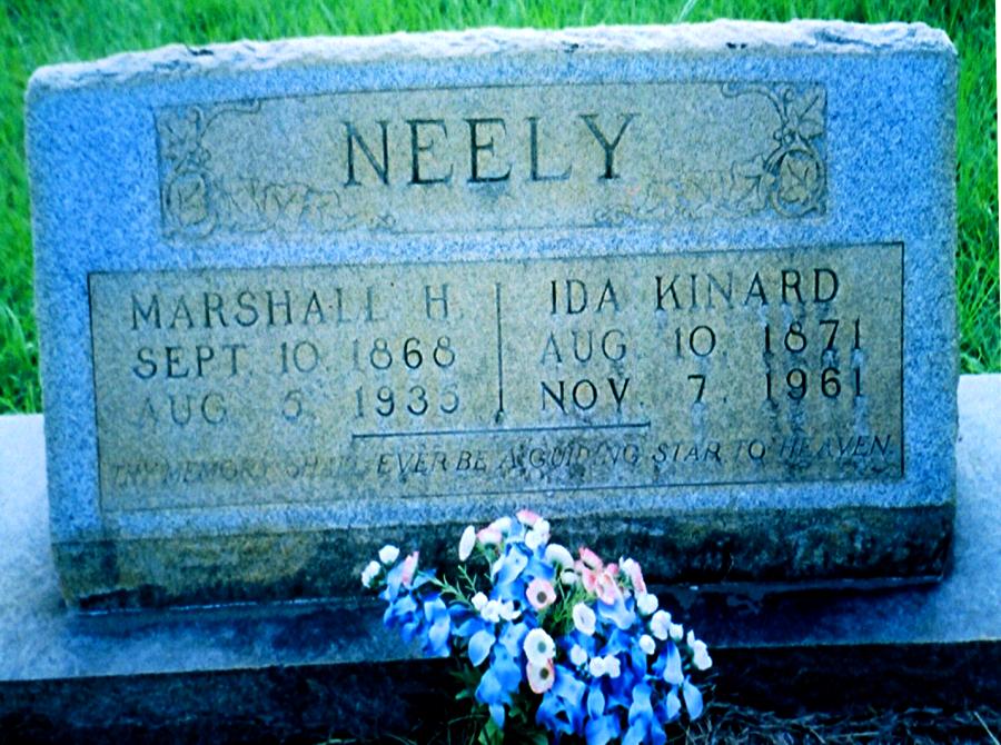 | Neely, Ida Kinard | Aug 10, 1871 | Nov 7, 1961 | "THY MEMORY SHALL EVER BE A GUIDING STAR TO HEAVEN" Double Stone with Marshall H. Neely [d/o George Kinard & Unknown Brown; sister of Ozie Kinard; son Ervin E. Neely; two daughters: 1) Geneva married & had 2 children who are still living in Warren; 2) Verna married Van Daniel; he died about a year later; they had no children & she never remarried] | CM |