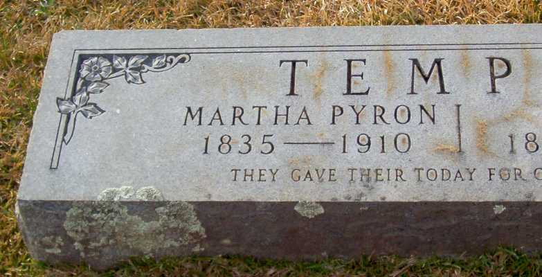 | Temple, Martha Pyron | 1835 | 1910 | Double Stone with John H. Temple; “THEY GAVE THEIR TODAY FOR OUR TOMORROW” | PC |