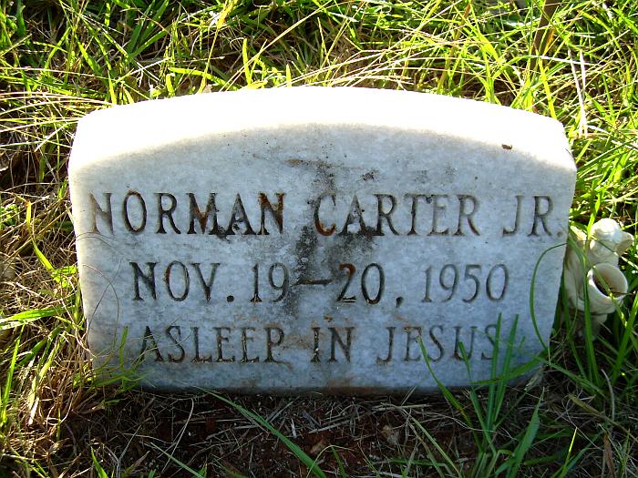 | Carter, Norman Jr. | Nov. 19, 1950 | Nov. 20, 1950 | "ASLEEP IN JESUS" [Infant s/o Norman & Sara Carter; grand s/o George Izack Carter & Nannie Walker] | SW |