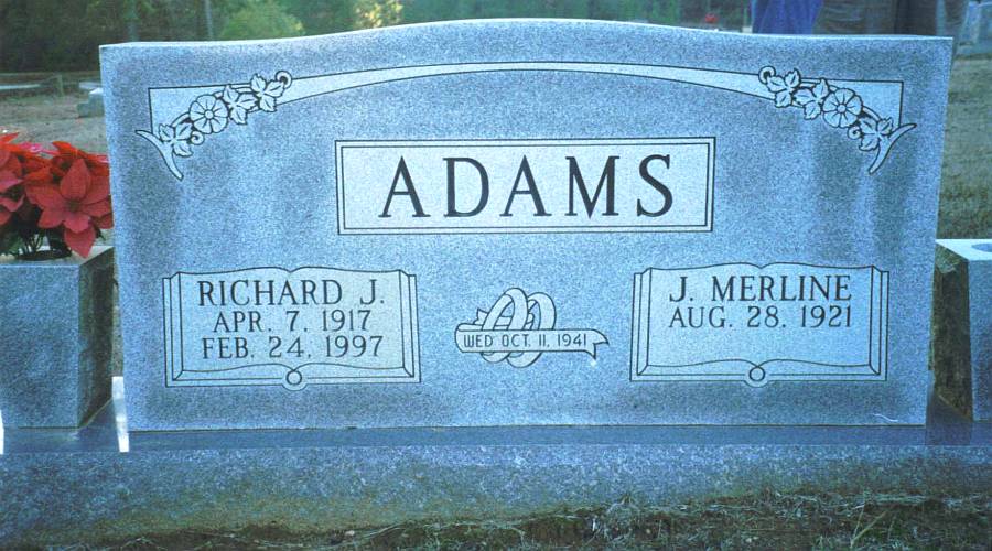 | Adams, Richard J. | 7 Apr. 1917 | 24 Feb. 1997 | Double stone with J. Merline Adams [s/o William Jack Adams & Eda Anna Neely] | CM & RW |