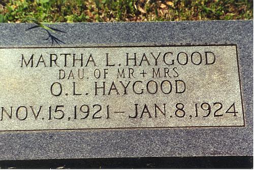 | Haygood, Martha L. | Nov. 15, 1921 | Jan. 8, 1924 | "Dau. of Mr. & Mrs. O.L. Haygood" | DP |