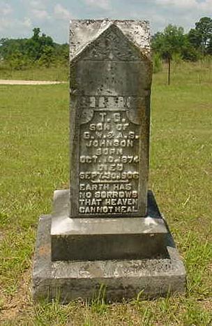 | Johnson, T. G. | 10 Oct 1874 | 30 Sep 1906 | "SON OF G. W. & A. S. JOHNSON" "EARTH HAS NO SORROWS THAT HEAVEN CANNOT HEAL" | DP & JM |