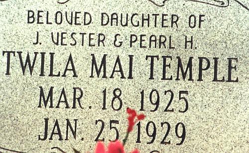 | Temple, Twila Mai | Mar. 18, 1925 | Jan. 25, 1929 | "Beloved daughter of J. [Joseph] Vester & Pearl H. [Haygood]" | DP & BB |