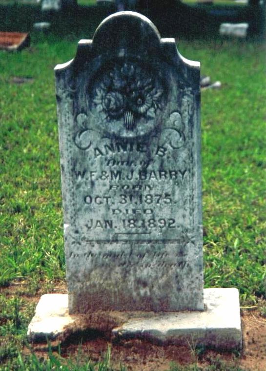 | Barry, Annie B. | 10/31/1875 | 1/18/1892 | "Dau. of W. F. & M. J. BARRY" | TG |